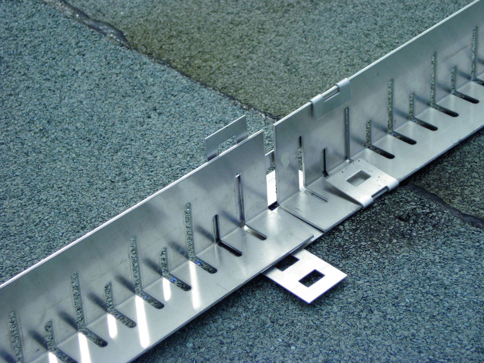 Die Montage unserer Kieswinkel erfolgt zerstörungsfrei. Speziell entwickelte Kieswinkelhalter werden mit geeignetem Kleber direkt auf der Abdichtungsbahn fixiert – ohne Schrauben, ohne Durchdringung. Die Kieswinkel selbst rasten an den Halterlaschen ein und lassen sich von Hand befestigen. Bei Stossverbindungen empfehlen wir einen kleinen Abstand zwischen den Profilen, damit thermische Längenänderungen aufgefangen werden.
