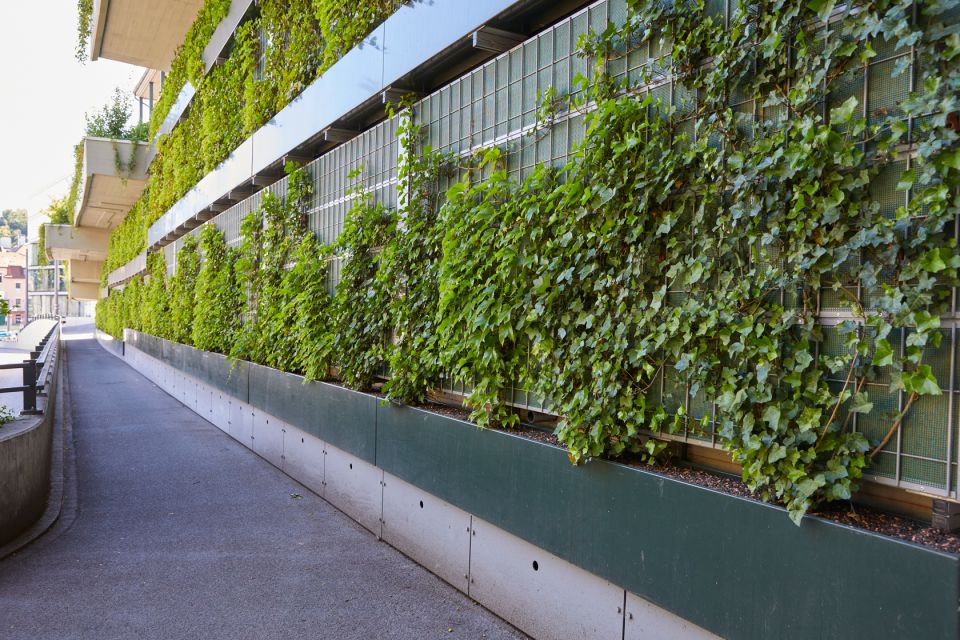 Bepflanzte Lärmschutzwände bieten gleich mehrere Vorteile: Sie verschönern die Wand und machen sie zu einem lebendigen Gestaltungselement. Pflanzen filtern Feinstaub aus der Luft und verbessern das Mikroklima. Und sie bieten Lebensraum für Vögel und Insekten.